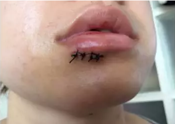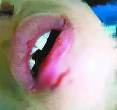 王女士唇内伤口较深,缝合4针,受损门牙有待后续治疗。