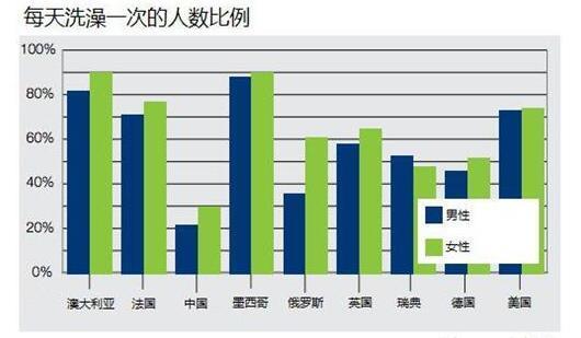 相信大家的第一反应一定是不洗澡,所以才那么臭!其实不是,2008年最爱洗澡的国家是澳大利亚,墨西哥,美国,每天洗澡的人几乎到了全部人口的60-80%,而2008年的中国人只有20-30%的人是每天洗澡的。但这种情况下,欧美人的体味还是普遍比东亚的中日韩国家重。