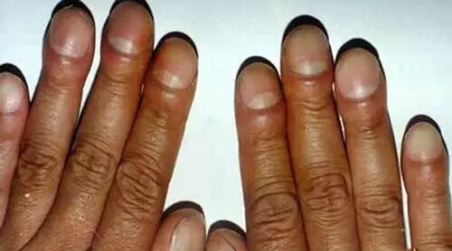 杵状指除了指 / 趾末端变大以外,指甲也会有所改变,比如指尖的甲面弧度会明显增大。
