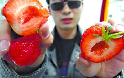 草莓用了催熟剂后,生长期变短,颜色鲜艳,但果味变淡。那些中间有空心、形状不规则的大个草莓,都是被催熟的。草莓看起来红,吃起来酸,只要沾着催红素的地方,都会变红,而正常的草莓红得不均匀。